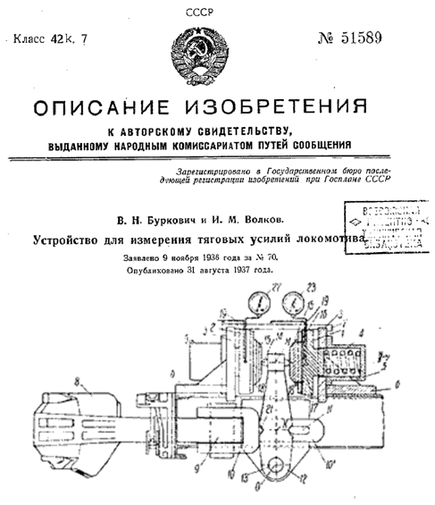 Рисунок 6.3 – Схема устройства для измерения тяговых усилий локомотива (патент СССР №51589 от 31.08.1937)