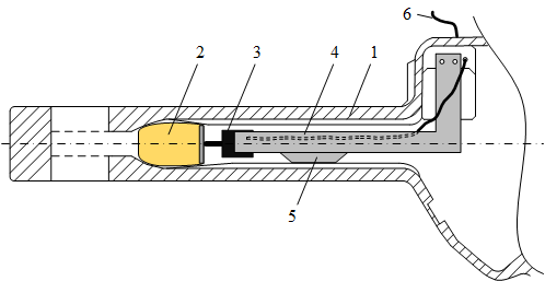 Устройство устанавливается внутрь полого хвостовика автосцепки 1 и обеспечивает формирование на выходе 6 электрического сигнала, пропорционального деформациям хвостовика при приложении тяговых или тормозных сил. Устройство состоит из распорного блока 2, датчика линейных перемещений 3, Г-образного кронштейна 4. Перед установкой деталей измерительного устройства из автосцепки вынимаются все подвижные детали: замок, замкодержатель, подъемник замка, валик и предохранитель. Распорный блок 2, выполняющий функцию заднего упора, устанавливается в дальний конец внутренней полости хвостовика автосцепки 1 через проём для замка и замкодержателя в корпусе головки автосцепки и закрепляется для предотвращения продольных смещений. Датчик перемещений 3 крепится к Г-образному кронштейну 4 и устанавливается таким образом, чтобы его исходное положение соответствовало свободному положению автосцепки, без приложения сжимающих или растягивающих сил. Г-образный кронштейн 4 крепится к вертикальной площадке на стенке внутренней полости головки автосцепки 1. В нижней части Г-образного кронштейна 4 предусмотрен опорный скользун 5, обеспечивающий восприятие вертикальной нагрузки консольно закрепленного Г-образного кронштейна 4.