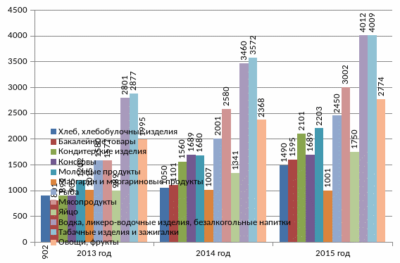 При этом, наибольшее увеличение наблюдается по водке, ликеро-водочным изделиям, безалкогольным напиткам (по сравнению с 2013-2014 гг. прирост составил 659 тыс.руб., а в период 2014-2015 гг. 552 тыс.руб. ) и табачным изделиям и зажигалкам (2013-2014 гг. прирост составил 695 тыс.руб., а в период 2014-2015 гг. 437 тыс.руб. ).