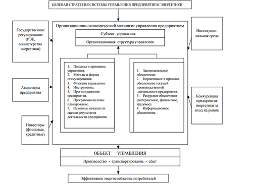 В итоге, механизм функционирования предприятия в энергетике выглядит следующим образом: совокупность действий предприятия, организационных структур, конкретных методов управления, а так же управляющего воздействия акционеров, инвесторов, в рамках существующих институциональных норм и регулирования, в направлении повышения эффективности энергоснабжения.
