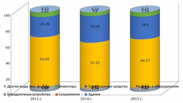 Рисунок 2.3 - Структура и динамика основных фондов ООО «Региостройснаб» за 2013–2015 гг.