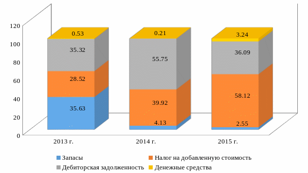 Налог на добавленную стоимость увеличился на 49,87% в период 2013-2015 гг. Произошло снижение дебиторской задолженности на 24,85%. Денежные средства в 2015 г. по сравнению с 2013 г. увеличились на 294 тыс. руб.