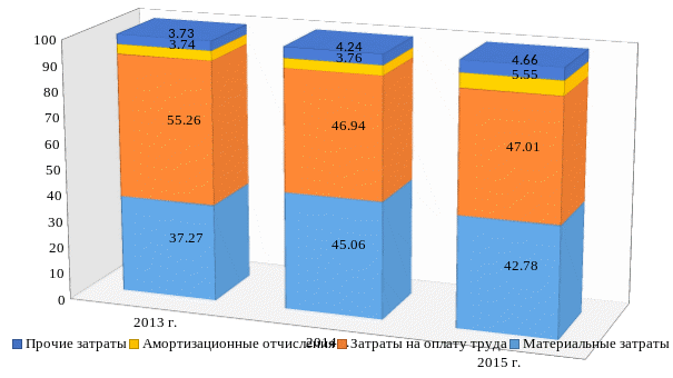 Финансовые результаты деятельности любого предприятия напрямую зависят от его затрат. Рассмотрим структуру затрат предприятия за 2013 – 2015гг., проанализировав имеющиеся данных в таблице 2.