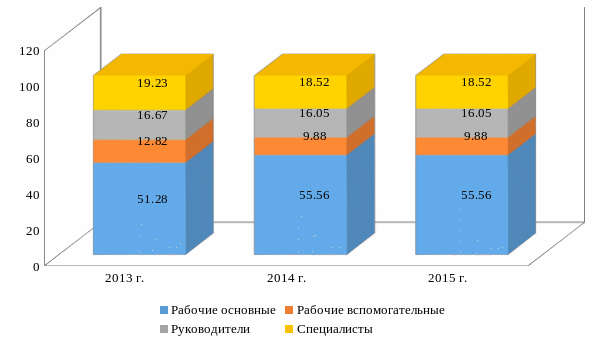 Из данных таблицы следует, что основную долю персонала предприятия составляют рабочие: 64,1%, 65,43% и 65,43% соответственно в 2013, 2014 и 2015 гг. Численность служащих за период исследования не менялась.
