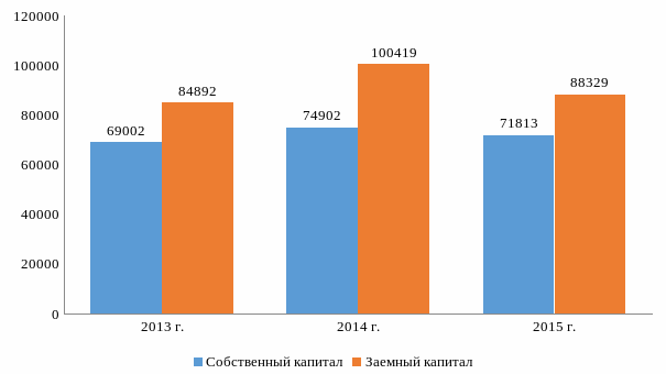 Рисунок 2.7 - Динамика источников капитала ООО «Региостройснаб» за 2013 – 2015 гг., тыс. руб.