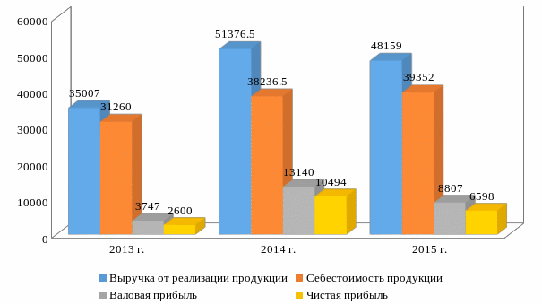 Данные таблицы показывают, что в 2014 г. по сравнению с 2013 г. прибыль от продаж увеличивается на 250,68% или на 9393 тыс. руб., а в 2015 г. по сравнению с 2014 г. уменьшается на 32,98% или на 4333 тыс. руб., это связано с увеличением затрат в 2015 г. по сравнению с 2014 г. на 2,92% или на 1115,5 тыс. руб. и с уменьшением выручки от реализации продукции на 6,26% или на 3217,5 тыс. руб., что вызвано увеличением расходов на материалы, электроэнергию, ремонт технологического оборудования.