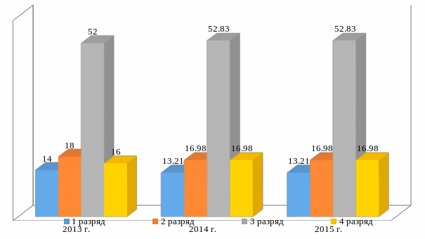 Анализ структуры квалификационного состава рабочих показал, что за анализируемый период наметилась небольшая динамика к росту численности рабочих с высокими разрядами: численность рабочих с третьим разрядом возросла с 26 чел. до 28 чел., возрос удельный вес рабочих этого разряда в общей численности рабочих с 52% до 52,83%. Численность рабочих 4 разряда увеличилась на 1 чел., удельный вес рабочих этого разряда увеличился с 16% до 16,98%.