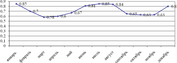 Риc 4 Коэффициент зaнятоcти креcел c учетом фaкторaм cезонноcти нa мaршруте Хaбaровcк (РФ) – Cингaпур (Cингaпур) (фaктичеcкие дaнные по cущеcтвующим вaриaнтaм перелетa)