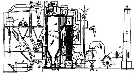 Рисунок 1.1 - Котельная установка с барабанным паровым котлом при сжигании твердого топлива: 1 – барабан-сепаратор; 2 - опускные трубы из барабана; 3 - экранные подъемные трубы; 4 - экономайзер; 5 - пароперегреватель; 6 - воздухоподогреватель; 7 - горелочное устройство; 8 - пароохладитель; 9 - указатель уровня воды; 10 - манометр; 11 - предохранительный клапан; 12 - главная паровая задвижка; 13 - углеразмольная шаровая барабанная мельница; 14 - сепаратор пыли; 15 - пылевой циклон; 16 - транспортер сырого угля; 17 - бункер сырого угля; 18 - питатель сырого угля; 19 - клапан для пропуска угля или пыли; 20 - бункер пыли; 21 - регулятор подачи пыли; 22 - мельничный вентилятор; 23 - короб горячего воздуха; 24 - воздухозаборник; 25 - дутьевой вентилятор; 26 - скрубберный золоуловитель; 27 - дымосос; 28 - дымовая труба; 29 - шлакоприемник; 30- канал шлако- или золоудаления; 31 - колонны каркаса котла; 32 - непрерывная продувка из барабана; 33 - продувка нижних коллекторов поверхностей нагрева; 34 - трубопровод питательной воды; 35 - питательный регулирующий клапан
