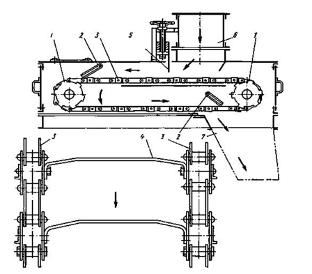 Рисунок 1.2 - Скребковый питатель сырого угля (внизу показан вид сверху на участок цепи):