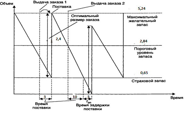 Все параметры модели управления запасами с фиксированным размером заказа рассчитаны в таблице 3.5 таким образом, что при соблюдении заданных границ исходных данных за время выполнения заказа запас снижается с порогового до страхового уровня запаса. При получении поставки в срок фиксированный размер заказа восполняет запас до желательного максимального уровня. При наличии сбоев поставок бездефицитность обслуживания потребления обеспечивает страховой запас.