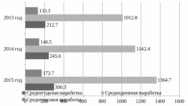 Анализируя данные таблицы 3.4 можно сделать вывод, что в 2015 году произошел рост объемов потребления нефтепродуктов, вследствие чего произошло увеличение объема реализации, также наблюдается увеличение среднегодовой выработки одного рабочего в 2014 году по сравнению с 2013 годом на 32,91 тыс. руб. Также увеличилась среднедневная выработка на 129,53 руб., и среднечасовая выработка на 13,19 руб. Наблюдается увеличение среднегодовой выработки рабочего в 2015 году по сравнению с 2014 годом на 54,61 тыс. руб., увеличение среднедневной выработки рабочего на 222,272 руб., и среднечасовая выработка на 26,28 руб. Таким образом, увеличение объема реализации нефтепродуктов повлекло за собой увеличение производительности труда.