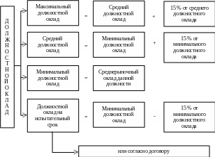 Нижняя граница вилки оклада, то есть минимального должностного оклада, будет соответствовать среднему уровню рыночной стоимости должности. Но если финансовое положение компании не позволяет, тогда минимальный должностной оклад будет таким же, как и минимальный рыночный.