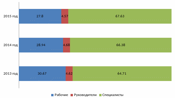 Проанализировав данные таблицы 2.4 можно сделать следующие выводы. Среднесписочная численность Хабаровской дистанции сигнализации, централизации и блокировки с 2013 года до 2014 года имела небольшую тенденцию к спаду (уменьшение на 3 человека или на 1,26%), но к 2015 году численность возросла на 3 человека по сравнению с 2013 годом и на 6 человек по сравнению с 2014 годом (на 2,55%). Численность рабочих имеет тенденцию к спаду на протяжении всего рассматриваемого периода (в 2014 году спад составил 5 человек, а в 2015 году – сокращение на одного человека). Число руководителей осталось неизменным. Численность специалистов возрастает: в 2014 году прирост составил 1,3%, а в 2015 году 4,49%. Всего с 2013 до 2015 года наблюдается увеличение числа специалистов на 9 человек.