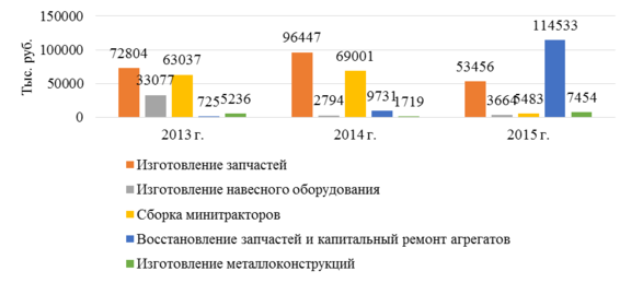 Анализ данных таблицы говорит о том, что в целом за 2013–2015 г.г. выросла реализация объемов услуг по ремонту агрегатов и сборке минитракторов более, чем в 15 раз каждая.
