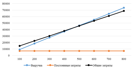 Наиболее наглядно на рисунках 3.1, 3.2, 3.3 (в соответствии с вышеуказанными видами деятельности) можно увидеть, до какого момента продукция не окупается, в какой точке затраты и доход равны нулю, и когда наступает момент прибыли от реализации.