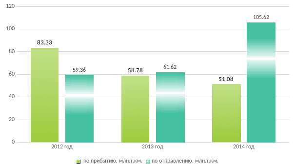 Из данной таблицы мы видим, что в 2013 году произошло снижение грузооборота по сравнению с 2012 годом на 15,62%. В 2014 году произошло увеличение грузооборота по сравнению с 2013 годом на 30,06%. В 2014 году по отношению к 2012 году грузооборот увеличился на 9,74%. В целом наблюдаем положительную тенденцию по отправлению грузов, в 2014 году по отношению к 2012 экспорт грузов увеличился на 77,93%. Данный показатель положительно влияет на экономику региона, а также на прибыль предприятия. Показатель по прибытию грузов значительно снизился в сравнении с 2012 годом и составляет 38,70%, это говорит о том, что наш регион стал более развитым и в меньшей степени нуждается в импортных грузах.