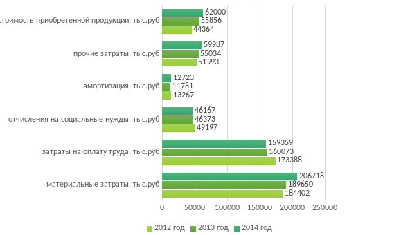 В 2013 году можем наблюдать увеличение расходов на 7757 тыс. руб. В 2014 году расходы по отношению к 2012 году незначительно снизились. В общем можем сказать, что предприятие работает стабильно.