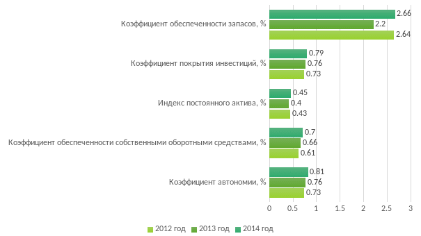 Коэффициент обеспеченности материальных запасов на последний день анализируемого периода равняется 2,66 и в сравнение с 2012 годом он вырос на 0,02. Ежегодный рост данного коэффициента положительно сказывается на финансовой устойчивости предприятия, значение коэффициента обеспеченности материальных запасов можно характеризовать как очень хорошее.