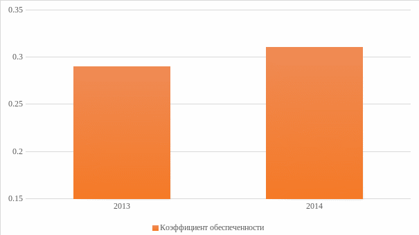 Как видно из рисунка 2.5, предприятие обладает достаточным объемом собственных оборотных средств, необходимых для ее финансовой устойчивости. В 2014 г. это показатель составлял 0,29. В 2015 г. данный коэффициент возрос до 0,31. Данная динамика показывает, что наблюдается рост обеспеченности собственными оборотными средствами, и на предприятии хватает оборотных средств, чтобы обеспечить свою финансовую устойчивость.
