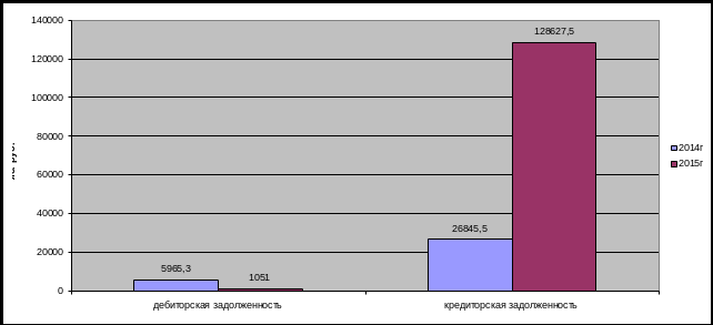 В исследуемом периоде дебиторская задолженность постоянно снижается. За период она сократилась с 5965,3 тыс. руб. до 1051 тыс. рублей. Однако нужно заметить, что в 2014 году столь значительной задолженность была из-за нетипичной сделки (продажа материально-технических ресурсов ОАО Калужскому заводу Ремпутьмаш, оплата в январе 2015 года, согласно нетиповым условиям расчёта – в течение 30 календарных дней с момента выставления счёт-фактуры). Поэтому сокращение задолженности не было бы столь значительным.