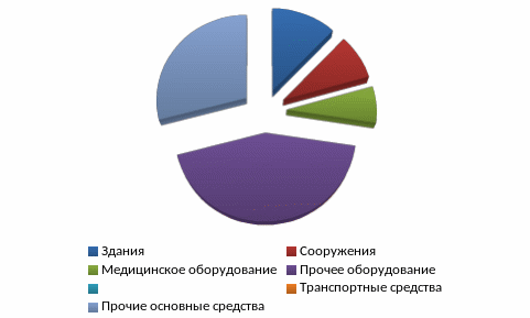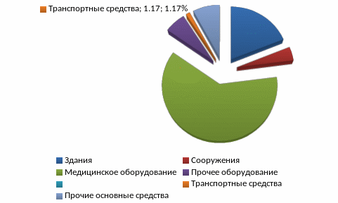 Из таблицы 2.3 видно, что наибольшую долю в составе основных средств занимает медицинское оборудование (на начало года – 66,36,на конец года – 61,88). Видовую структуру основных средств можно наглядно увидеть на нижеприведённых диаграммах (рисунок 2.1 и рисунок 2.2)