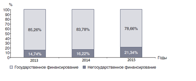 Большая доля в структуре посещений по источникам финансирования приходится на государственное финансирование (рисунок 2). Доля посещений за счет негосударственного финансирования 2013–2015гг. составляет в среднем 15,48%.