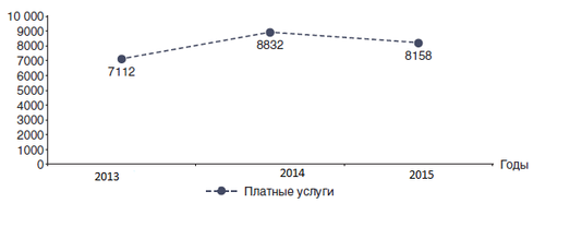По данным таблицы 3.1 можно проследить динамику посещений по платным услугам, она носит скачкообразный характер (Рисунок 3.1). В 2014 г. наблюдалось резкое увеличение (на 24%), а в 2015 г. – снижение объемов оказания платных услуг (на 7,6%).