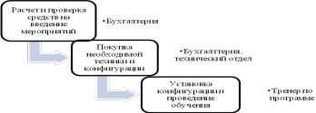 Организация внедрения проекта будет проходить по нескольким этапам: расчет финансовых средств на проведение мероприятий, покупка необходимой техники и конфигурации, установка конфигурации специалистами, проведение обучения тренером новым навыкам, начало работы в новых помещениях и с новым оборудованием, эти предложения представлены на рисунке рисунок 3.1.