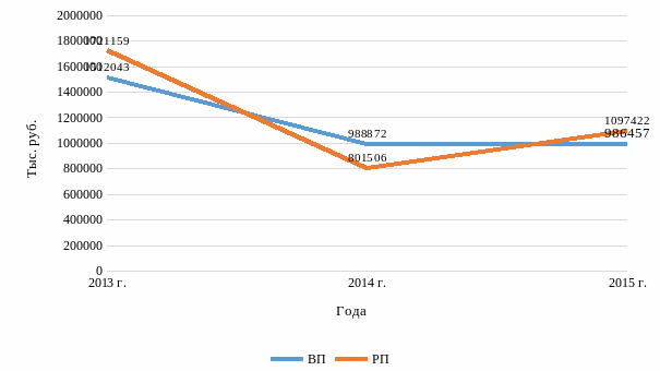 Из таблицы 2.2 видно, что за 2013–2015 гг. объем производства снизился 53,8%, а объем реализации – на 25,9%. Данный факт говорит о том, что предприятие реализует остатки нереализованной продукции прошлых лет.