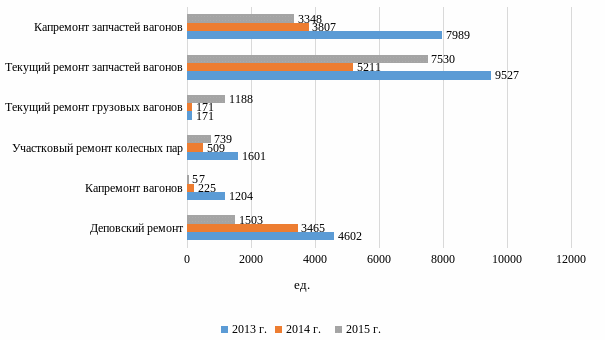 Однако наблюдается рост числа текущих ремонтов грузовых вагонов в 5,95 раз. Также имеется тенденция роста участкового ремонта колесных пар и текущего ремонта запчастей вагонов относительно 2014 г.
