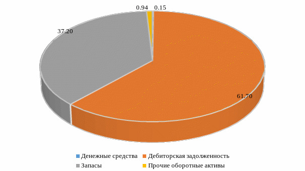 Согласно данных таблицы наибольший удельный вес в общей сумме оборотных средств занимает краткосрочная дебиторская задолженность, причем ее доля выросла с 2013 к 2015 г. с 35,55 до 61,70%. А доля запасов на предприятии АО «ВРК–1», напротив, сократилась с 63,84 до 37,20%. Незначительный удельный вес занимают денежные средства и прочие оборотные средства, доля которых в 2015 г. составила 0,15% и 0,94% соответственно. Таким образом, большая доля дебиторской задолженности существенно увеличивает потребность в заемном капитале, повышает издержки и ухудшает рентабельность предприятия. Наглядно структура оборотных средств на предприятии АО «ВРК–1» в 2015 г. представлена на рисунке 2.11.