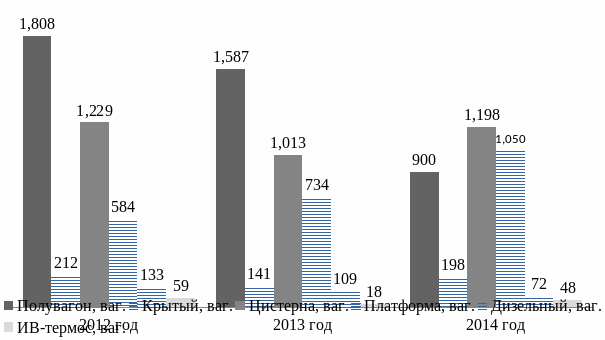 На капитальном ремонте вагонов в 2014 году наблюдается рост к 2012 году на 72 единицы или 147,1 %, за счет увеличения ремонта полувагонов на 95 единиц или 282,7 %. В 2014 году к 2013 году.