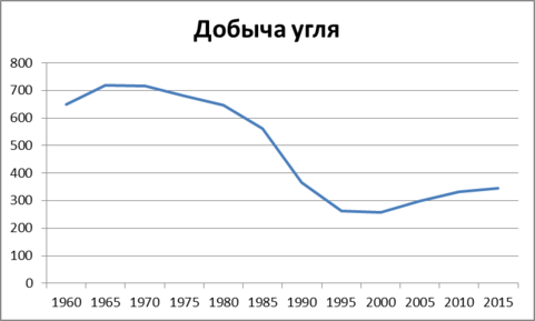 Соотношение разных видов топлива в топливно-энергетическом комплексе страны изменяется. Так, если до середины 60-х годов главную роль играл уголь, но в 70-е годы доля угля начала сокращаться, динамика изменения объемов добычи угля до 2016 года представлена на рис. 3.1.