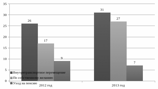 Из рисунка, видно, что сокращение контингента произошло по ряду причин: увольнение в связи с внутритранспортным перемещением в 2012 году – 26 человек, в 2013 году 31 человек; по собственному желанию было уволено в 2012 году 17 человек, в 2013 году – 27 человек; факт ухода на пенсию составляет в 2012 году – 9 человек, в 2013 году – 7 человек. Общее сокращение штата на 17 человек к 2013 году.