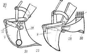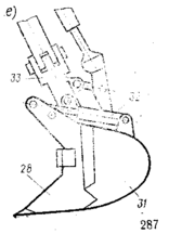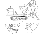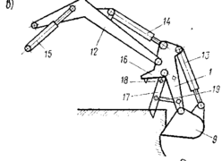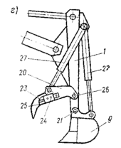 Разработаны различные органы адаптируемого типа. С помощью рабочего оборудования экскаватора (рисунок 1.6, г) наряду с экскавационными работами выполняют скалывание мерзлого грунта, перенос предметов больших размеров. Оборудование состоит из рукояти 1, ковша 9 и поворотной рамы 20, посредством шарнира прикрепленной к рукояти. Ковш 9 соединен с рукоятью 1 шарниром 21. Привод ковша и поворотной, рамы выполнен в виде гидроцилиндров 22 и 27. На поперечной балке рамы, в средней ее части выполнен карман, в котором установлен режущий зуб 23. Кроме того, на торцах поперечной балки предусмотрены сквозные карманы 24, в которых установлены зубцы 25. Рама крепится к рукояти шарниром 26. Во время рыхления ковш упирается в стенку забоя, а рама под действием гидроцилиндра 27 поворачивается.