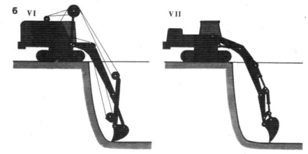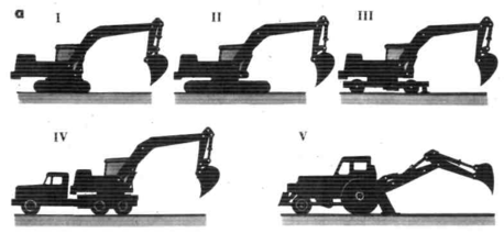а — по типу ходового устройства, б — по подвеске рабочего оборудования; I — гусеничный, II — гусеничный с увеличенной поверхностью гусениц, III — пневмоколесный, IV — на специальном шасси, V — на базе трактора, VI—с гибкой подвеской, VII— с жесткой подвеской