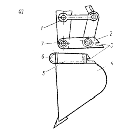 Нетрадиционные виды сменного рабочего оборудования и рабочих органов позволяют более полно использовать возможности гидравлических экскаваторов. Для быстрой замены рабочих органов разработаны различные устройства. Устройство фирмы «Катерпиллер» США типично (рисунок 1.6, а) и состоит из шарнирно соединенной с рукоятью 1 рамки 2, которая вводится между параллельными щеками 5, смонтированными на задней стенке 4 ковша, кольцевыми выступами 7 в зевообразные вырезы 6 до смещения пазов 3.. Щеки и рамка фиксируются поперечной пластиной, вставляемой; в совмещенные пазы.