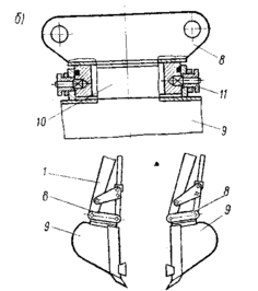 Для обеспечения возможности копания как при обратном, так и при прямом ходе ковша предусматривается соединение рабочих органов с рукоятью стрелового оборудования такое, которое обеспечивает смену вида рабочего органа за счет изменения его положения. Таковым является рабочее оборудование одноковшового экскаватора (рисунок 1.6,б), которое содержит опорную плиту 8, соединенную с рукоятью и тягами управления. Для ускорения и удобства замены одного рабочего органа, другим рукоять соединена с ковшом 9 посредством шарнира; вращения 10 и фиксирующего приспособления 11.