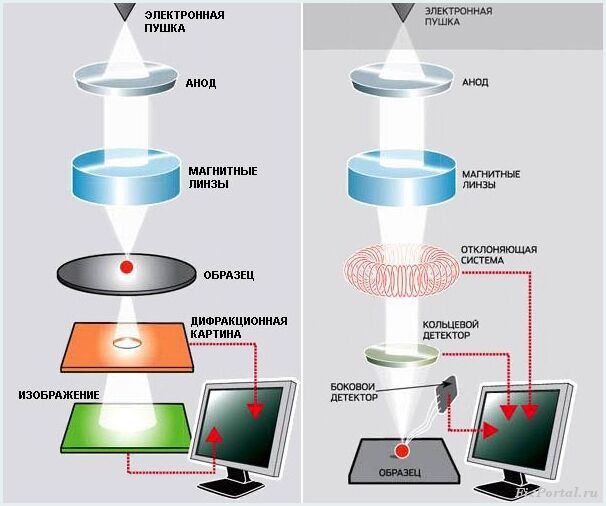 Рис. 1.1 – Принцип действия просвечивающей (слева) и сканирующей (справа) электронной микроскопии [1]
