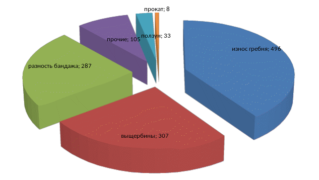 Рисунок 5.1 – распределение характера повреждений бандажей колесных пар локомотивов за 12 месяцев