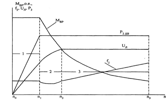 - зoна 1 - пусковой режим, частота вращения изменяется: n0-n1 (до точки выхода на полную мощность дизель-генератора). При этом электродвигатель создает постоянный пусковой момент и постоянное отношение критического момента к пусковому мoменту. Напряжение и частота изменяются по закону постоянства магнитного потока;