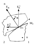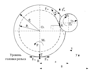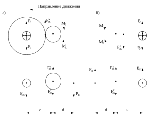 В нормальных условиях работы локомотива, опирающегося колесами на рельс, вследствие горизонтального противодействия рельс, сила Fзк вращает колесо около мгновенных центров скоростей в точках касания колес с рельсами. В точках касания колес с рельсами оказываются приложенными, кроме сил тяжести и вертикальной реакции рельса, горизонтальная сила
