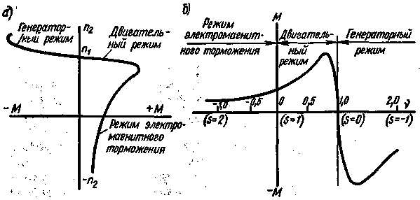 Рисунок 2.6 – График зависимости режимов работы асинхронной машины от скольжения: а) – зависимость момента от частоты вращения; б) – зависимость момента от скольжения