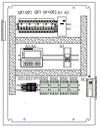 QF1 — Главный выключатель; QF2 — Общий выключатель на два насоса; QF3, QF4 — автоматы защиты двигателей; А1 — Реле контроля фаз; А2 — Блок питания; А3, А4— ПЛК Segnetics 2Gi, Модуль расширения МС-0201-01-0; А5 — Преобразователь частоты; ХТ1-ХТ3 — Клемные разъемы; КМ1-КМ4 — Контакторы; М — Вентилятор.
