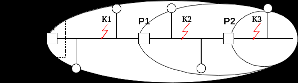 В представленной схеме вероятность отключения потребителей в границах конкретного участка ЛЭП необходимо разделить на вероятность отключения при возникновении КЗ на питающей ЛЭП и вероятность отключения при возникновении КЗ на конкретном ответвлении. При возникновении КЗ на питающей ЛЭП происходит отключение всех потребителей в границах конкретного участка. При возникновении КЗ на ответвлении происходит отключение только потребителей ответвления.