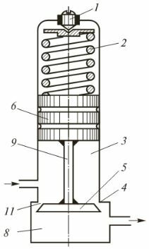 1 – регулировочный винт; 2 – основная пружина; 3 – полость высокого давления; 4 – седло клапана; 5 – клапан; 6 – поршень (плунжер); 7 – канал низкого давления; 8 – полость низкого давления; 9 – шток; 10 – канал высокого давления; 11 – дросселирующее отверстие