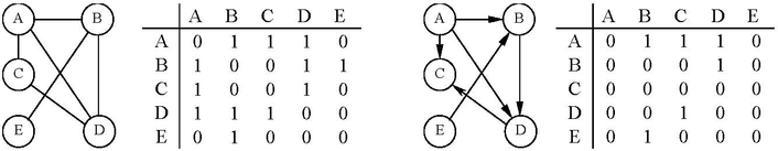 а) неориентированный граф и его матрица смежности б) ориентированный граф и его матрица смежности