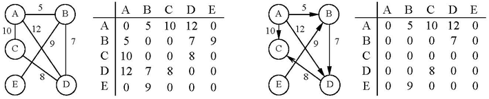 а) неориентированный граф и его весовая матрица б) ориентированный граф и его весовая матрица