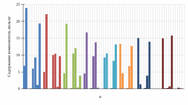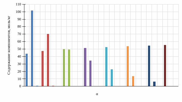Рисунок 7 – Содержание компонентов на срезе сопла при разных значениях α (кислород-керосин)